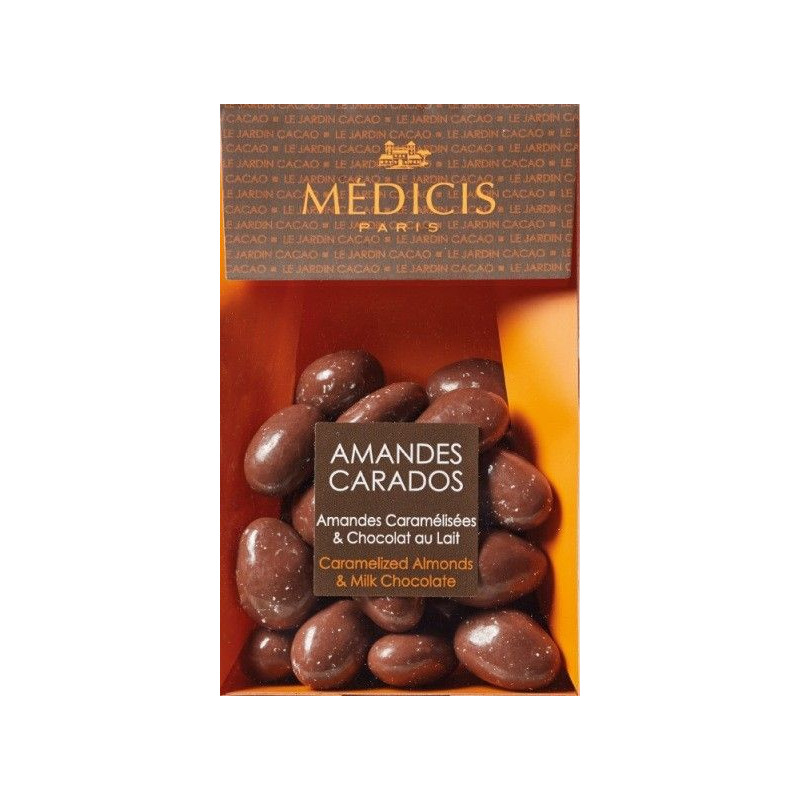 Les chocolats Medicis vous proposent des Amandes caramélisées et chocolat au lait, la finition est brillante avec effet scintillant blanc.