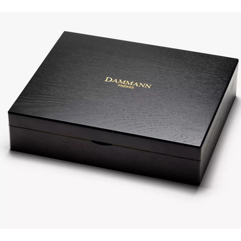 Le coffret se présente dans une boîte en bois noir laqué, élégamment siglée du logo Dammann en doré. Sa finition haut de gamme en fait un véritable objet de décoration aussi bien qu’un coffret pratique et durable. Il peut facilement être réutilisé pour conserver du thé en vrac, des sachets, ou même des accessoires de dégustation. Idéal pour les amateurs de belle présentation ou pour offrir un cadeau prestigieux et utile.