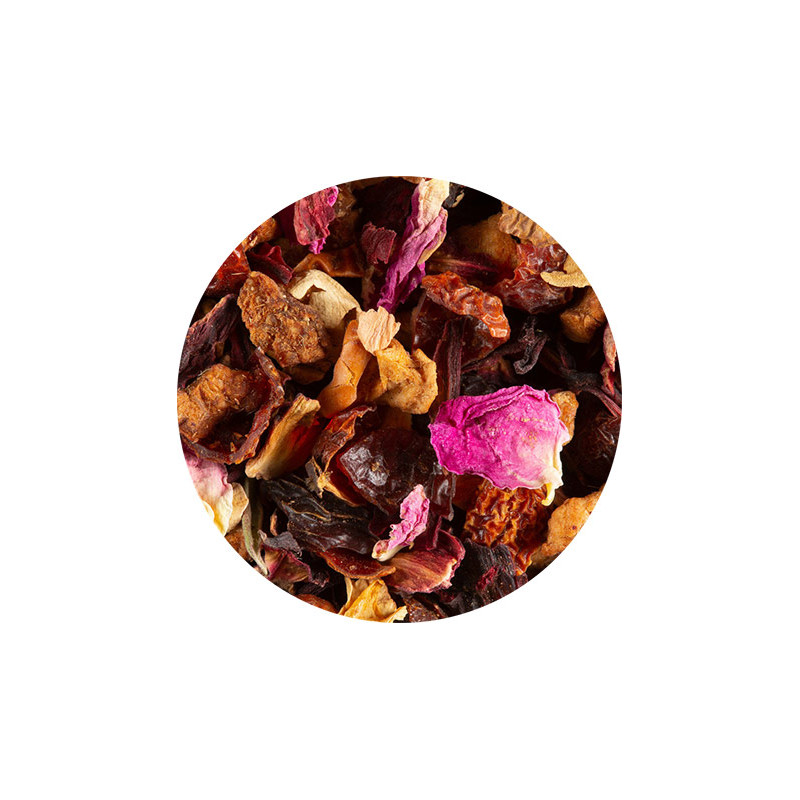 Sur une base de fleur d'hibiscus (carcadet) auquel on ajoute des écorces de cynorrhodon ainsi que des morceaux de pomme et des pétales de fleurs. L'aromatisation est de grande qualité, notamment avec de l'huile essentielle de citron vert et des arômes de litchi.