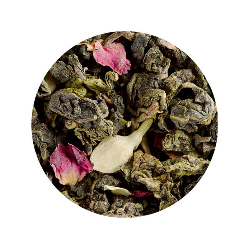 Le oolong se situe entre le thé vert et le thé noir, il est semi-fermenté. Cette version est particulièrement soignée avec une matière première des plus nobles. Son aromatisation est exceptionnellement fleurie.