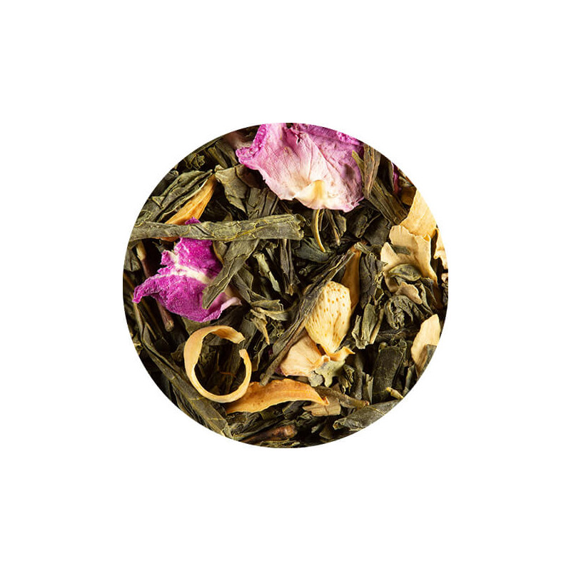 En effet, ce thé vert est parfumé aux huiles essentielles de bergamote, aux succulents arômes du kiwi, de la pêche jaune, de la fleur d'oranger et de la violette. Pour agrémenter le tout, il est parsemé de magnifiques fleurs d'oranger et de bleuet. Ces arômes proviennent des jardins séculaires de Versailles