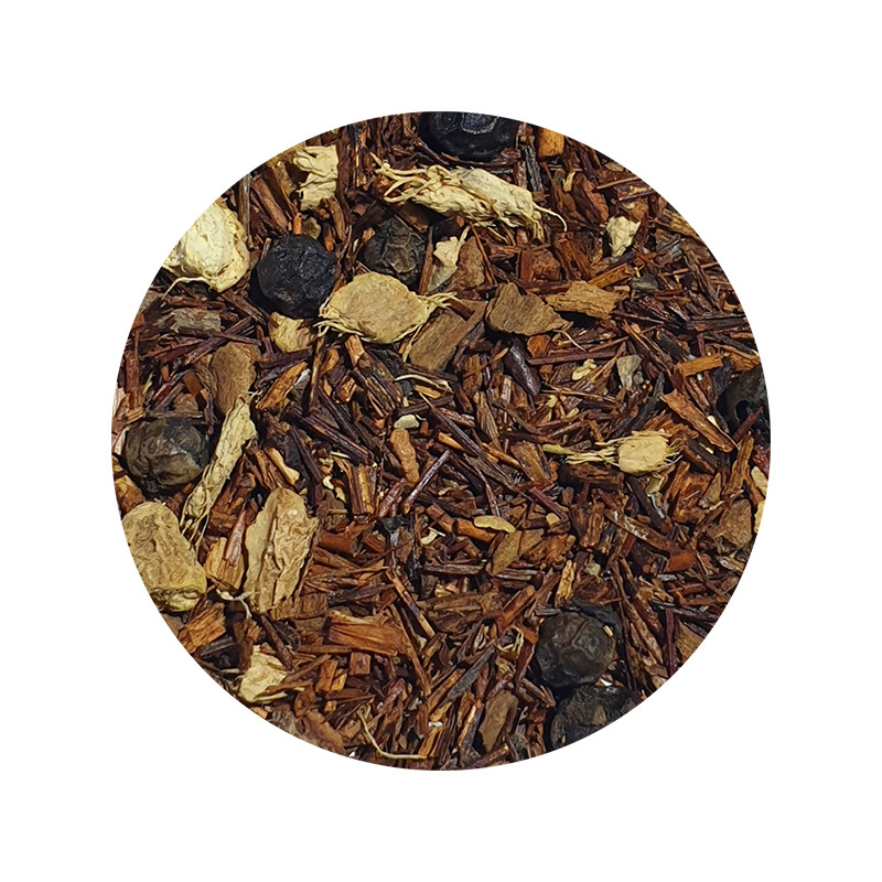 L'infusion Rooibos Chaï ou épicé est issue d'une association délicate entre rooibos, de la cannelle, des morceaux de gingembre finement coupés, des graines de cardamome broyées, un peu de poivre noir, de la réglisse, des écorces de cannelle, de l'extrait de vanille ainsi que des arômes naturels. Il offre de savoureux arômes doucement épicés. En tasse ce nectar donne une liqueur rouge orangé dévoilant de subtiles notes boisées, son coté épicé est riche et complexe tout en gardant une finesse agréable. Un réel plaisir gustatif !