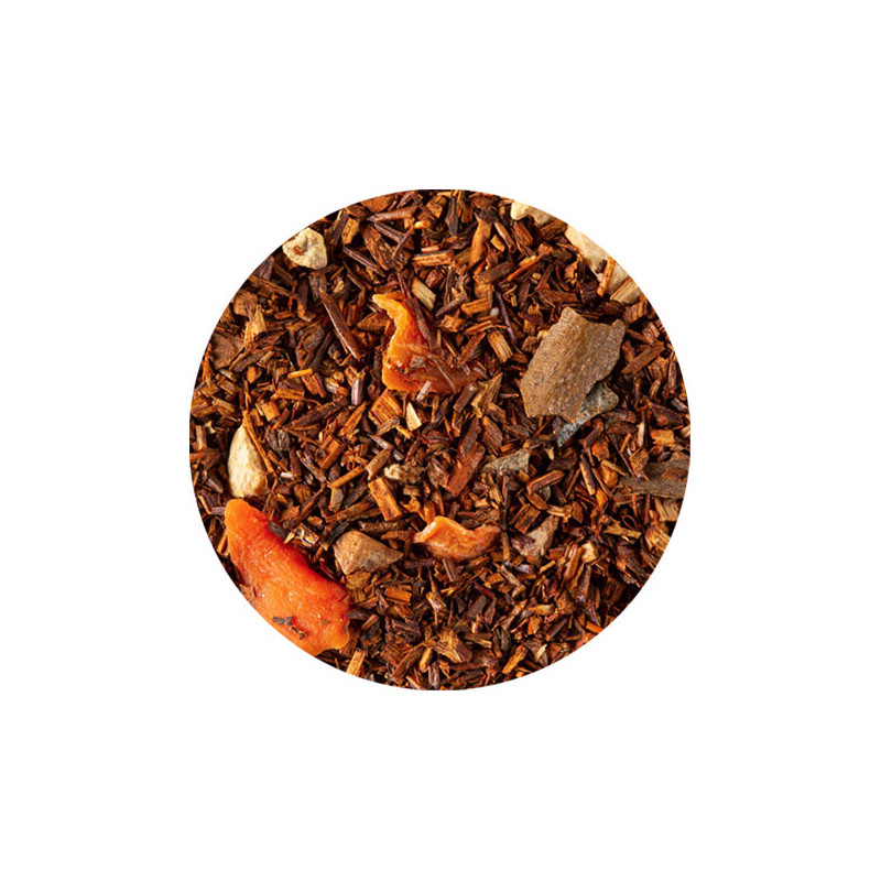 Sur la base de feuilles légèrement fermentées d'Aspalathus linearis un arbuste d'Afrique du Sud. C'est ce que l'on appelle plus simplement le rooïbos ! On y ajoute de la cannelle, du gingembre et des carottes, il fallait oser mais le résultat est simplement parfait. Pour relever davantage la recette, des arômes naturels d'amande, de noix de pécan et de biscuit. Ces derniers apportent de la rondeur, c'est également ce qui rappelle le goût du carott cake américain.