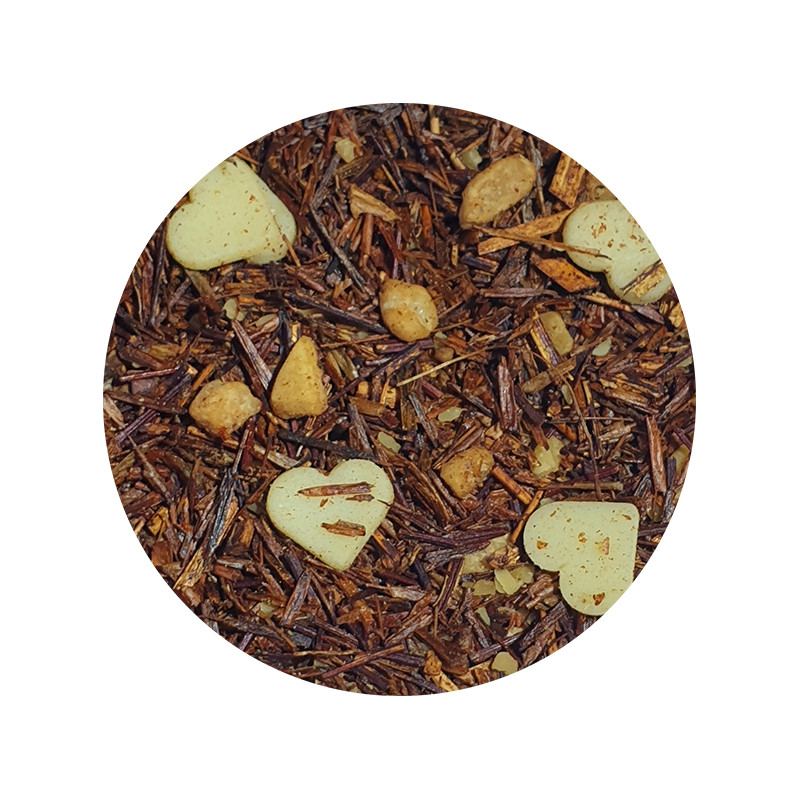 Il est convenu de le goûter avant, et d'en déduire la composition de cette infusion. Elle renferme un secret de fabrication que nous hésitions à vous révéler ! Mise à part les feuilles de Rooïbos, les morceaux d'amandes et d'amandes grilles, une touche de cannelle et un petit renfort d'arômes naturels, on peut apercevoir des petits cœurs blancs… Ils sont simplement composés de chocolat blanc, ils apportent de la douceur, une petite touche de lait et de vanille. A l'origine les autochtones le consommaient avec un peu de lait !