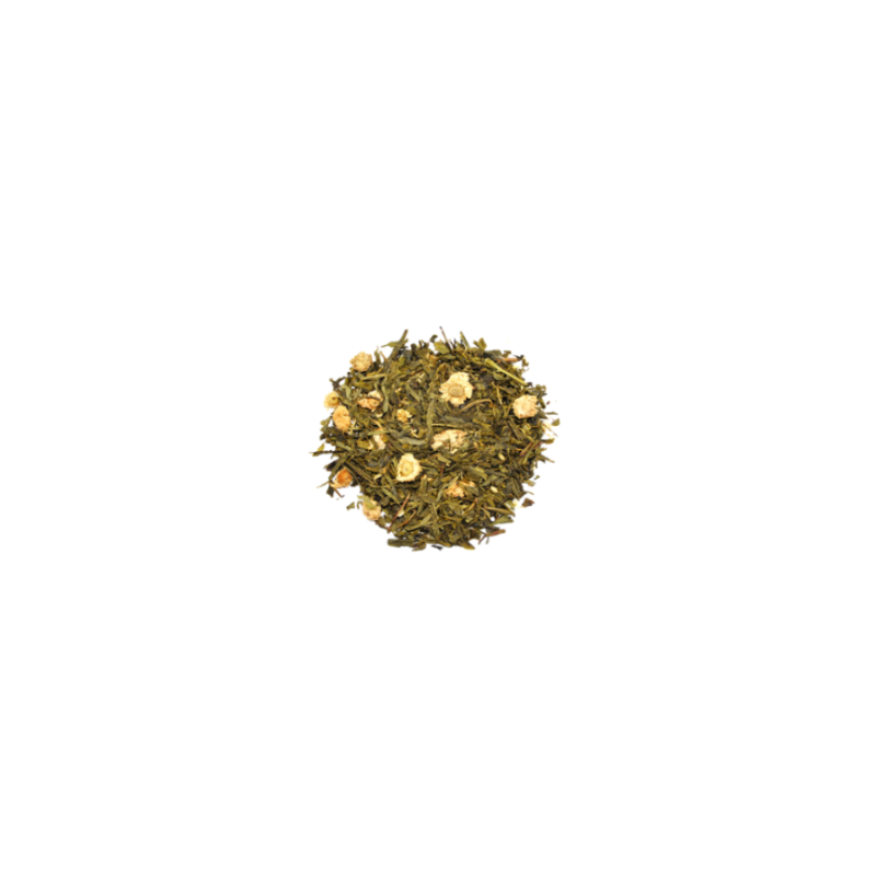 Le thé se compose d'un mélange de thé Sencha et Chun Mee parfumés, le tout agrémenté de brisures de marron glacé (Marron Imbert), décoré de fleurs de camomille romaine.