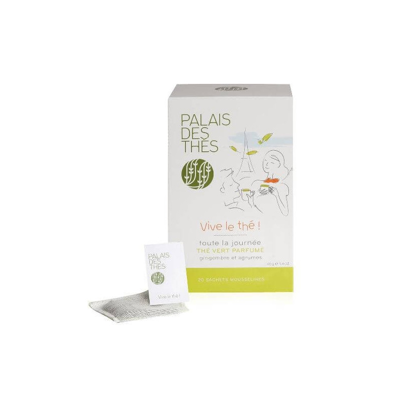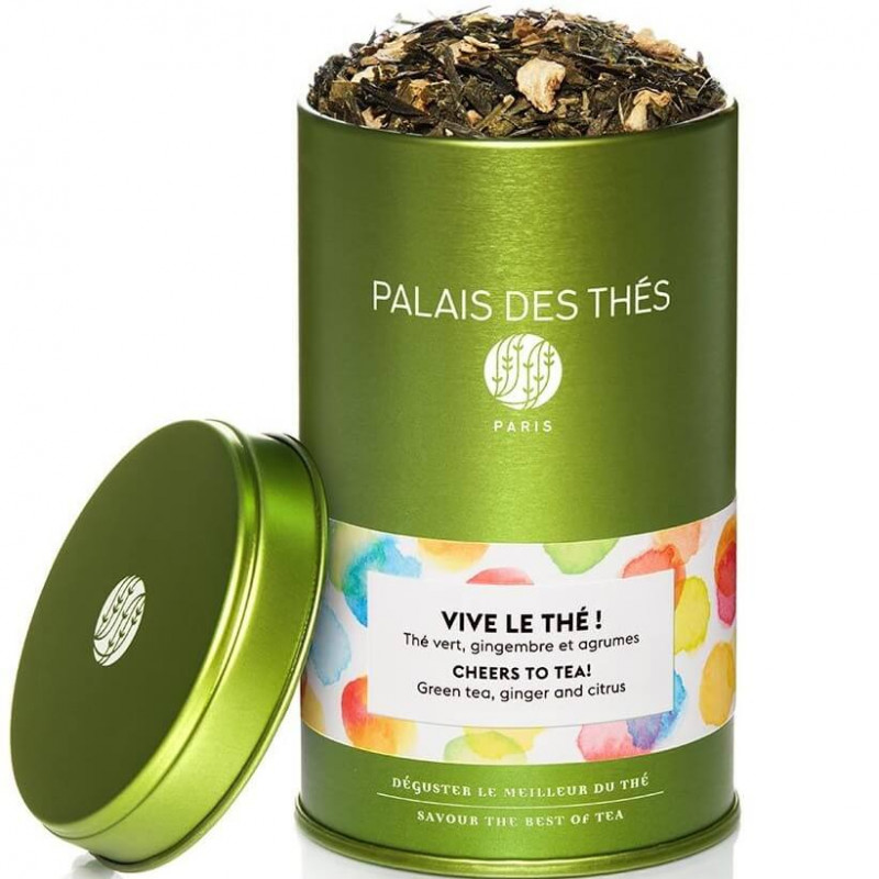 Le thé Vive le Thé ! est composé d'un mélange de 79 % de thé vert de Chine, de 15 % de gingembre, de 5 % d'écorces d'orange, d'arômes naturels et de 100 % de bonne humeur ! D'une odeur fraîche et agréable, il s'harmonise autour de notes zestées et autour du gingembre.