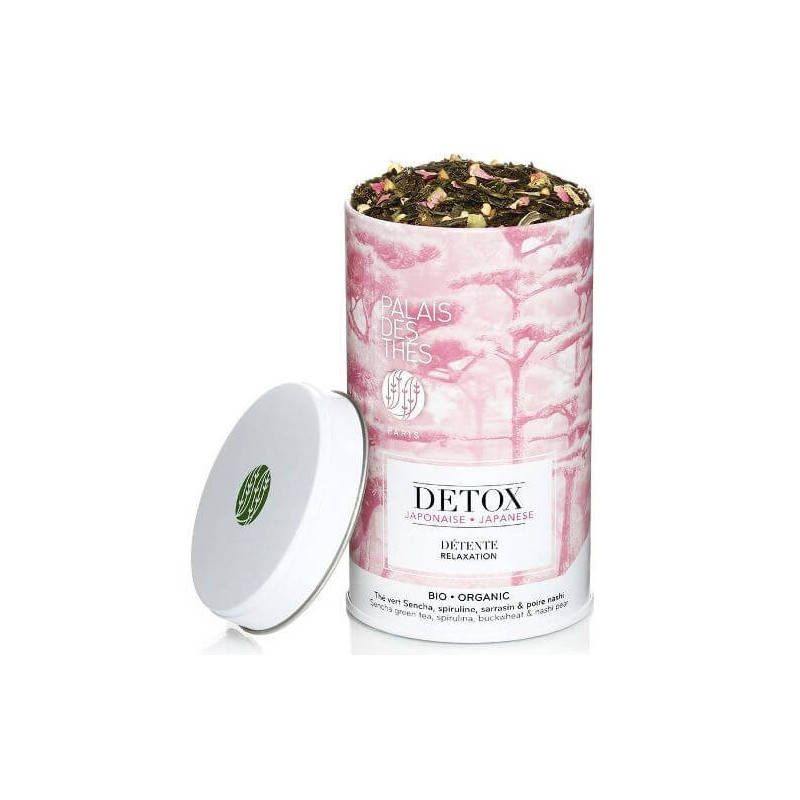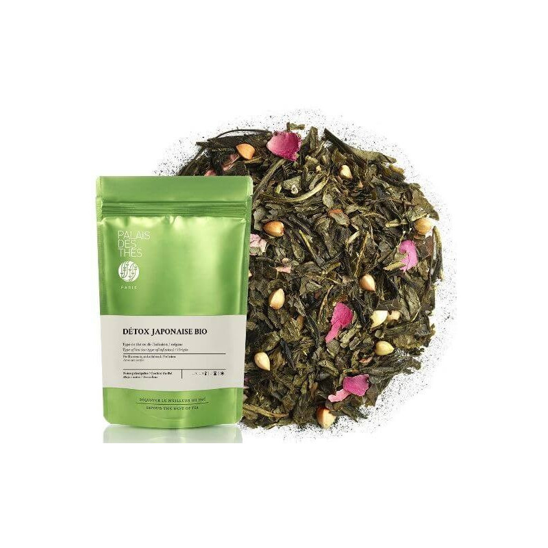 Le Thé Détox Japonaise est un thé vert BIO parfumé de détente. Il se compose de 75 % de thé vert Sencha*, de 5 % de sarrasin*, de 5 % d'arôme naturel de poire, de 3 % de spiruline* et de pétales de rose*.