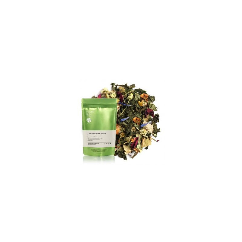 Jardin des Songes est une infusion composée de pommes et d’écorces d’orange (15%), de camomille (10%), de verveine citronnelle (10%) de mélisse (10%), de tilleul, de feuilles d’ortie, de fleurs (bleuet, lavande, rose) et d’arômes naturels. Visuellement, c’est une composition artistique. Imaginez la fragrance et le goût de cette création Palais des Thés. Il se consommera en soirée.