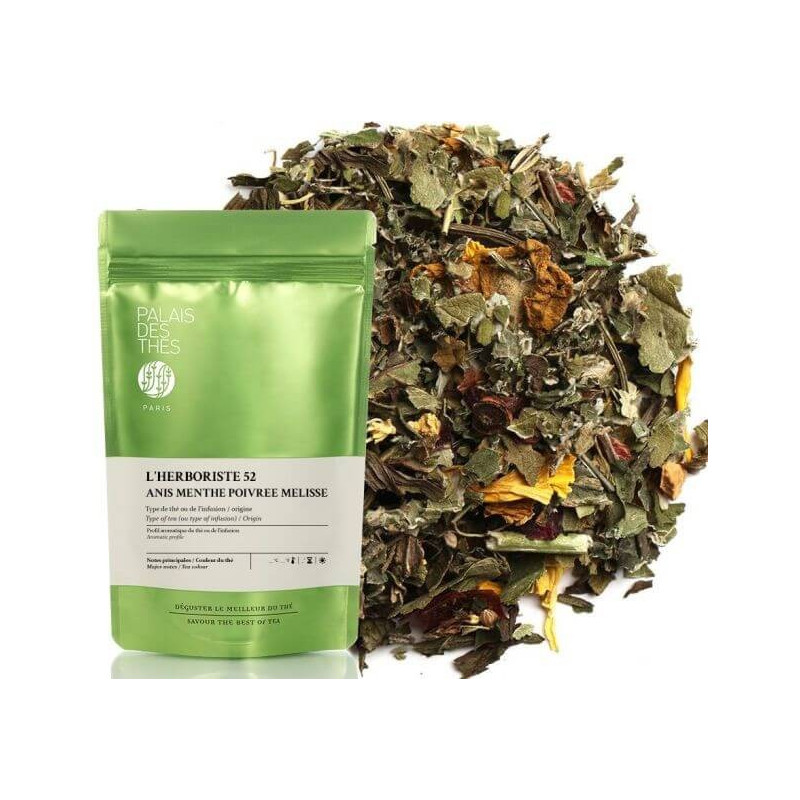 L'infusion l'Herboriste n°52 contient de la menthe poivrée (10%), de l'anis (9%), du murier et de la mélisse (2%), des feuilles de framboisier, du plantain, du fraisier, du cynorrhodon, de la pomme, du fenouil, des fleurs (sureau, tournesol, pivoine, molène) et des arômes.