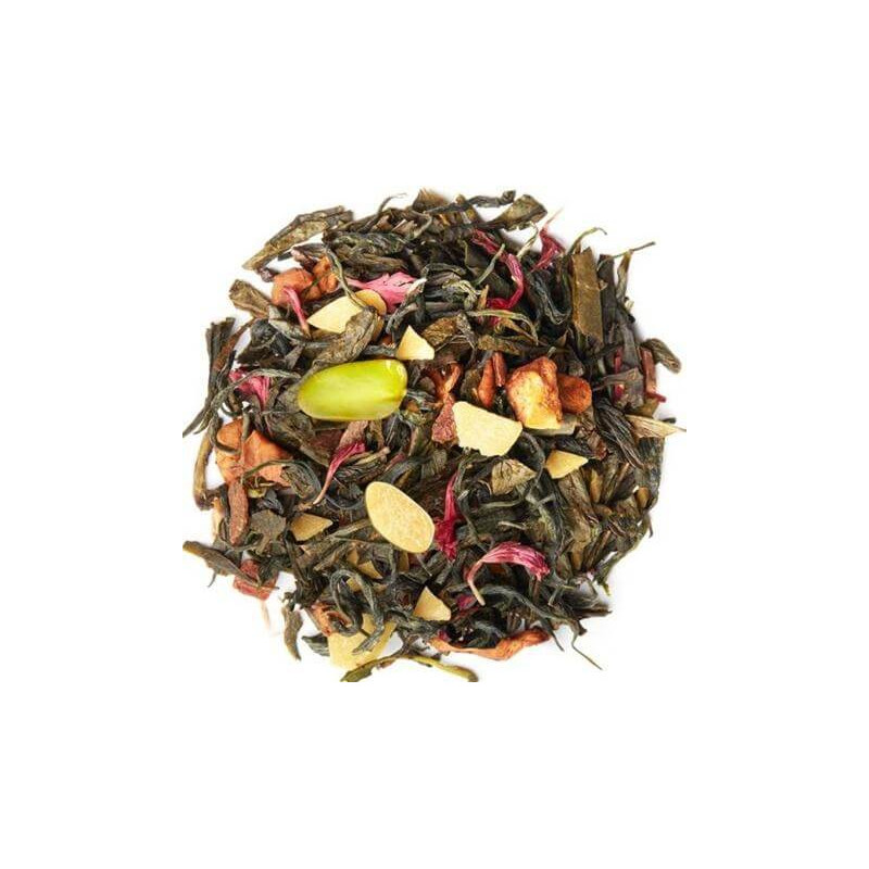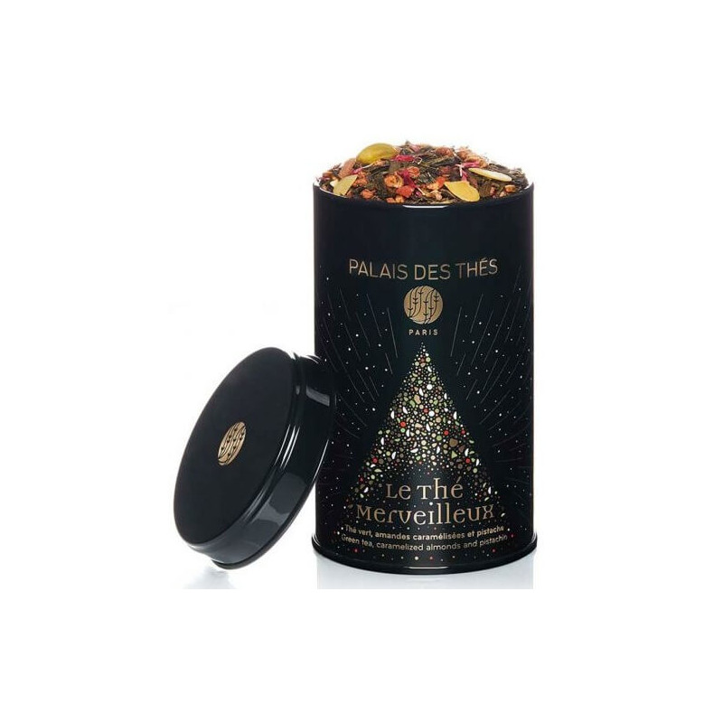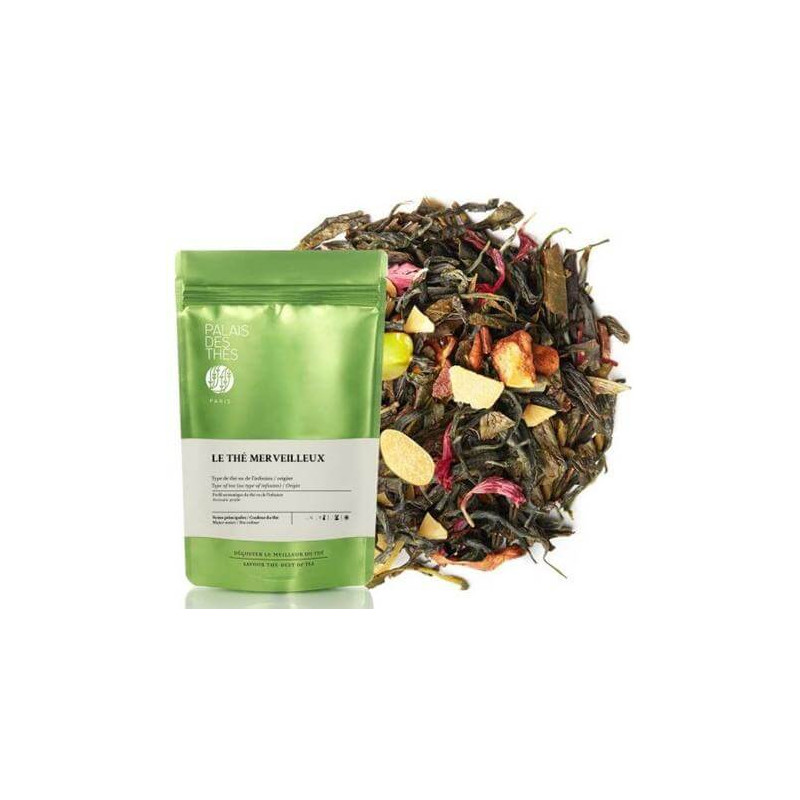 Le Thé Merveilleux contient du thé vert de Chine (55 %), de la pomme, de la cannelle, des arômes et de l'amande (3,5%), de la pistache (1%) mais aussi des pétales de bleuet.